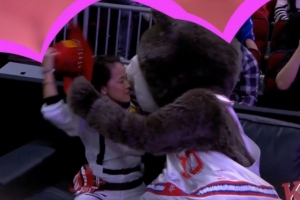 火箭主場(chǎng)迎戰(zhàn)馬刺,暫停是kiss cam環(huán)節(jié),鏡頭給到一位穿著馬刺球衣的球迷和他的女伴,隨后火箭吉祥物火箭熊叫來保安“逮捕”這位球迷,并和他的女伴熱吻。